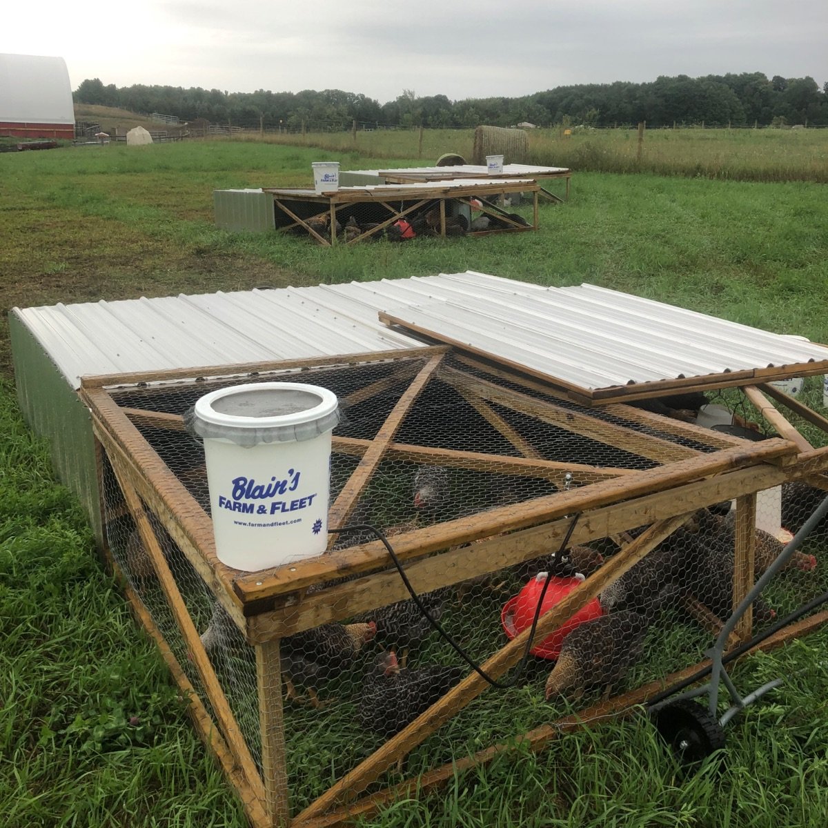The picture is of our new chicken “tractors”, which are dragged across the field daily. Inside lives your broiler chickens, who have access to fresh grass daily. We’ve started raising our own meat birds, although you will continue to see some from our Amish friends.