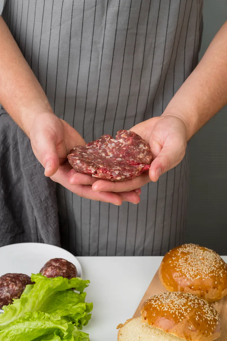 Divide the mixture into six equal portions and shape them into burger patties. Make a slight indentation in the center of each patty to prevent them from puffing up while cooking. - Cook the burgers:
