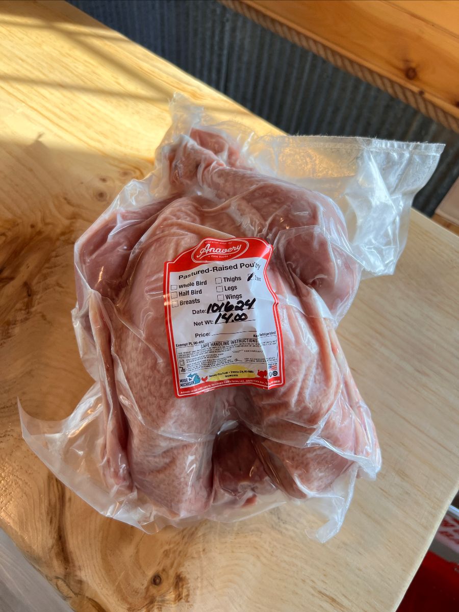 • Our turkeys spent their lives foraging on pasture and eating locally-sourced non-GMO feed. These birds were raised in northern Michigan on the same partner farm where our chickens are raised and help support local, family-run agriculture.